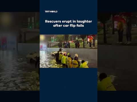 Mexican rescue workers erupt into laughter after falling into floodwaters while trying to flip a stuck car in Mexico City on June 3.