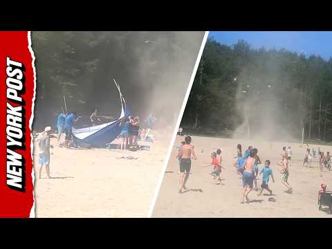 A visitor captured the terrifying and chaotic moment a dust devil tore through Grafton Lakes State Park’s Long Pond beach in New York – which sent objects flying through the air and children running and screaming in fear.