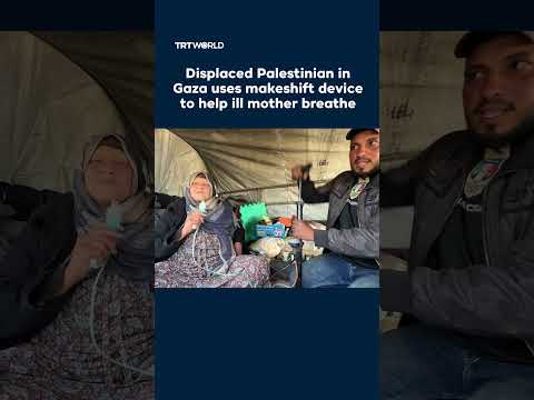 A displaced Palestinian man uses a tyre inflation pump as a makeshift breathing aid for his chronically ill mother who suffers from heart disease, diabetes, high blood pressure and asthma.