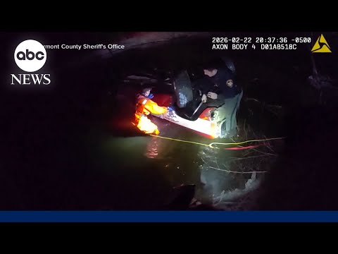 Body camera video captured the rescue of a 19-year-old trapped in her overturned vehicle after losing control of it on a winter road and crashing into the Little Miami River in Ohio.